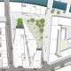 Der vorgeschlagene Baukörper reagiert mit zwei Rücksprüngen auf die Höhe der Nachbarbebauung. Diese deutlich sichtbaren Rücksprünge sind zugleich Ausdruck des Raumprogramms: der breitere Baukörper unten (bis 4. OG) mit Café u. Büroräumen und die schmaleren und darüberliegenden Geschosse mit Wohnräumen (bis zum 11. OG). Die Terrassen, die durch die Rücksprünge entstehen, bieten großzügige, begrünte Außenbereiche. Eine öffentlich nutzbare Gartenanlage nimmt die lineare Gliederung der Fassade auf und kann zusammen mit dem Café im EG als ein öffentlicher Raum genutzt werden.